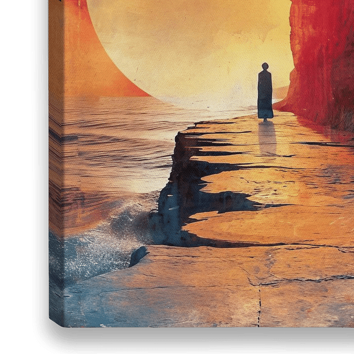 Cette œuvre d'art montre une scène dramatique et pittoresque sur une côte au coucher du soleil. Une personne solitaire, vêtue de sombre, se tient au bord d'un chemin caillouteux et regarde un énorme soleil rouge-orangé en arrière-plan. La scène est peinte dans des couleurs chaudes et contrastées, avec une forte séparation verticale…