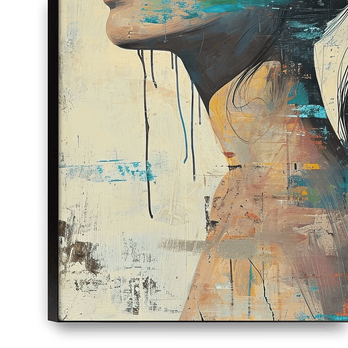 Regard caché - Ce portrait expressif d'une femme portant un bandeau crée une déclaration visuelle puissante avec ses textures contrastées et ses bandes de couleurs vives qui tranchent sur la bande sombre recouvrant ses yeux. L'arrière-plan est un mélange calme de tons neutres qui soutient et accentue la netteté des taches de couleur au premier plan, créant ainsi un look moderne et dynamique.