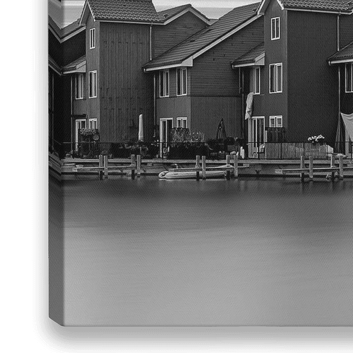 Une photo 2:1 en noir et blanc avec une longue exposition des célèbres maisons sur le Reitdiephaven dans la ville de Groningen.