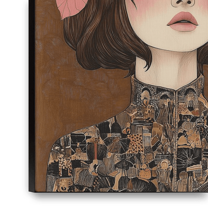 Dreaming in Autumn Pink montre une femme les yeux fermés, entourée d'une atmosphère douce et apaisante. Ses cheveux bruns sont ornés de feuilles d'automne roses, évoquant un sentiment de beauté naturelle et d'impermanence. L'arrière-plan est d'un jaune ocre chaud, avec un subtil motif de grain, qui rehausse le ton terreux de l'automne.…