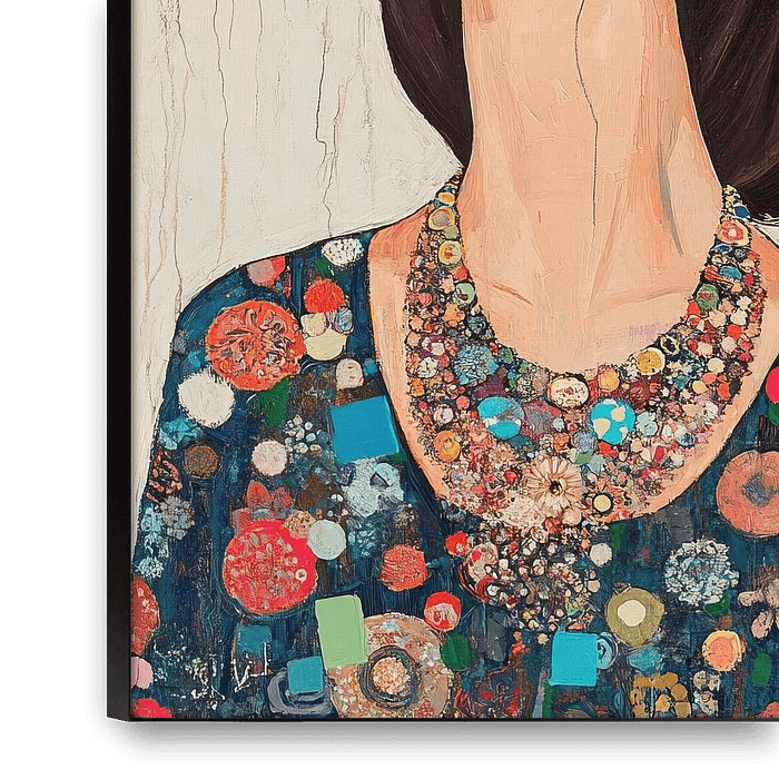 Sérénité colorée - Cette peinture pour femmes représente une femme sereine, les yeux fermés, la tête entourée d'un halo vibrant et coloré de fleurs, de bijoux et d'objets divers, dégageant un sentiment de tranquillité et de diversité.