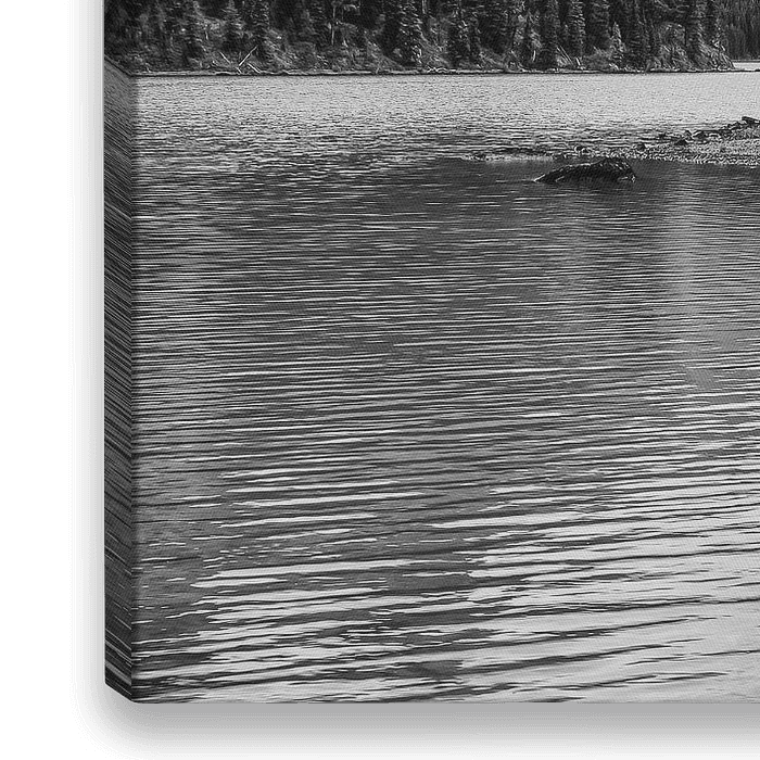 Photographie en noir et blanc de Spirit Island, une petite île attachée au lac Maligne dans le parc national de Jasper, en Alberta, au Canada. Ce point de repère est la destination des excursions en bateau sur le lac Maligne, image que de nombreuses personnes associent aux Rocheuses canadiennes.