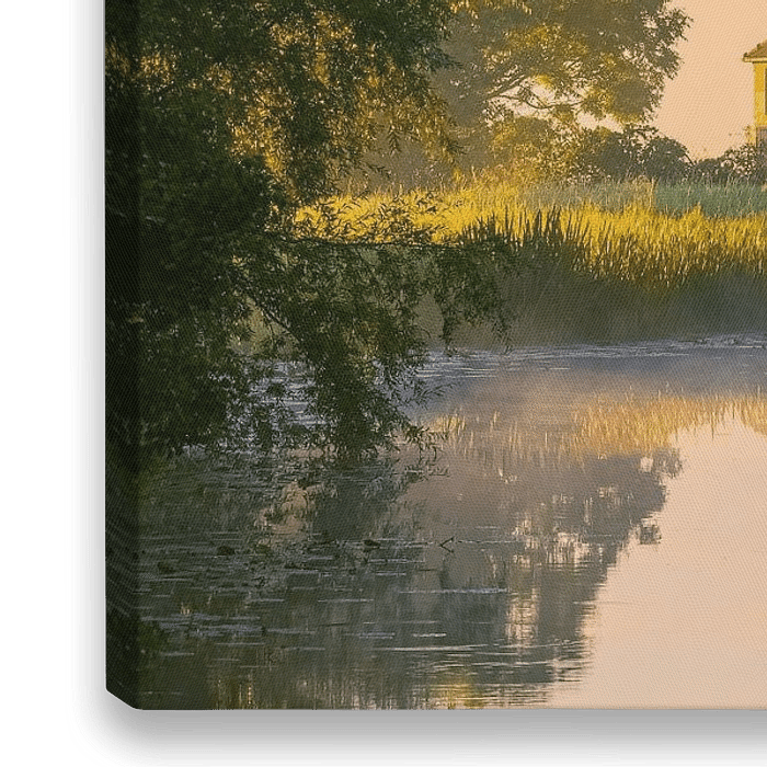 Photo horizontale 16:9 d'un petit matin d'été avec une couche de brouillard sur le Damsterdiep près du "Gemaal Ons Belang" ; situé entre Ten Boer et Ten Post dans la province de Groningen.