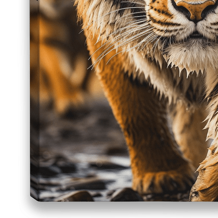 Tigre royal (Panthera tigris tigris) en train de chasser près d'un point d'eau au Bangladesh.