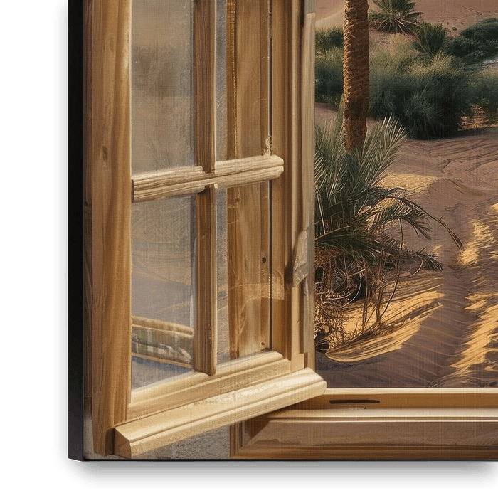 Achetez cette œuvre d'art de paysage Un paysage d'oasis à travers la fenêtre par Poster Art Shop sur toile, aluminium, ArtFrame ou photographie (encadrée), impression d'art en haute qualité et tout format.