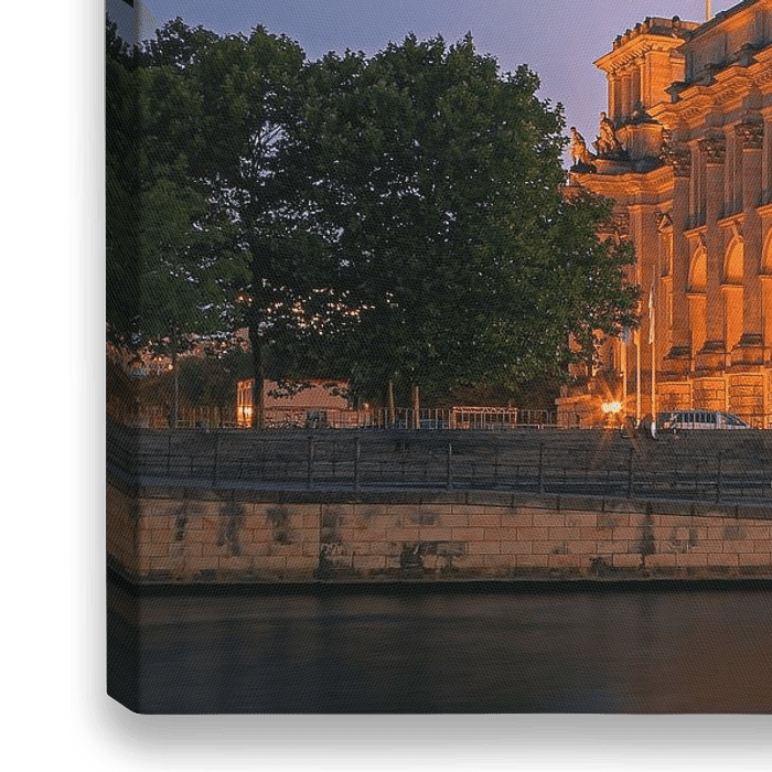 Photographie 16:9 d'une soirée au coucher du soleil le long de la rivière Spree, surplombant le bâtiment illuminé du Reichstag à Berlin, Allemagne.