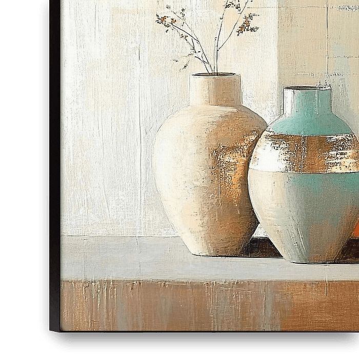 Vases | Palette calme, Moments tranquilles - Cette nature morte représente deux vases élégants posés sur une table en bois laqué brillant, sur un fond stratifié de tons doux et terreux.