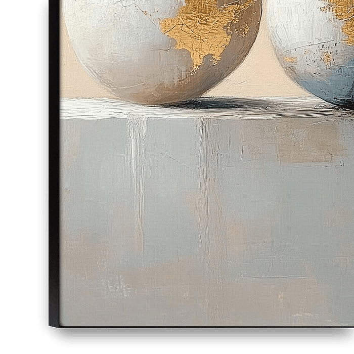 Vases en or | Échos d'or - Cette nature morte présente deux vases ronds aux finitions minimalistes or et gris, reflétés sur une surface brillante sur un fond beige à la texture douce.