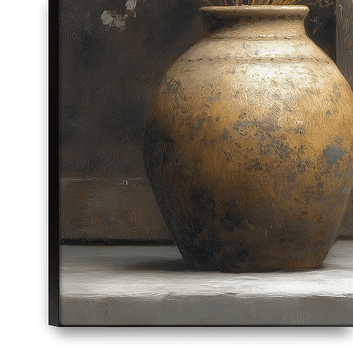 Détails : peinture de fleurs, peinture de fleurs, vases, nature morte, japonaise, vase en terre cuite, fleurs séchées, grand vase, petit pot, intérieur moderne, brun, blanc, beige, gris Couleurs : terre cuite, ocre, tons de terre, brun chaud, taupe, crème, blanc cassé, gris chaud, brun noir profond, accent doré