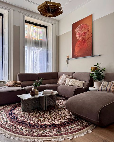 Le format portrait domine dans la collection Brun cognac et convient particulièrement bien aux murs étroits, aux couloirs ou aux espaces situés à côté d'une porte ou d'une fenêtre. Placez une œuvre verticale au-dessus d'une console dans l'entrée, ou utilisez-la pour structurer un pan de mur dans votre salon. Ce format allonge visuellement l'espace et attire le regard vers le haut. Si vous disposez d'un grand mur au-dessus de votre canapé ou de votre lit, un format carré ou paysage fonctionnera mieux : il occupe la largeur disponible et crée un point focal équilibré.