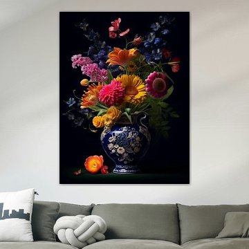 Cueillette de fleurs dans un vase bleu de Delft par INKR ART